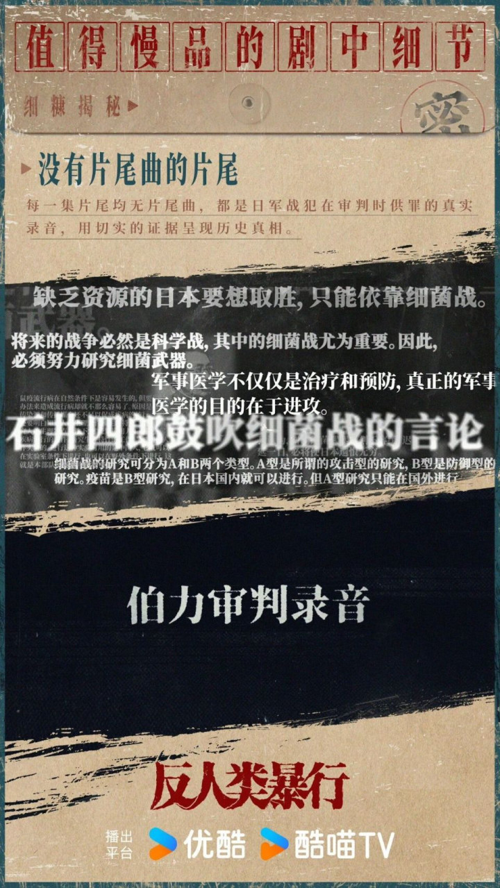 视听设计上,剧集没有滥用BGM以达到煽情目的,反而在每一集的片尾,取消了片尾曲的常规设置,使用伯力审判时日本战犯的史料以及真实供述录音来替代。这种“于无声处听惊雷”的纪实感,让剧集超越了常规的娱乐属性,成为一份厚重的史料。